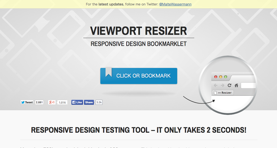 サ イトを表示すると中央付近に「CLICK OR BOOKMARK」と書かれたボタンが見えます。このボタンをクリックすると、Viewport Resizerが起動します。では早速クリック…の前に注意事項がありまして、こちらのツールは「Internet Explorerは対象外」なのです。